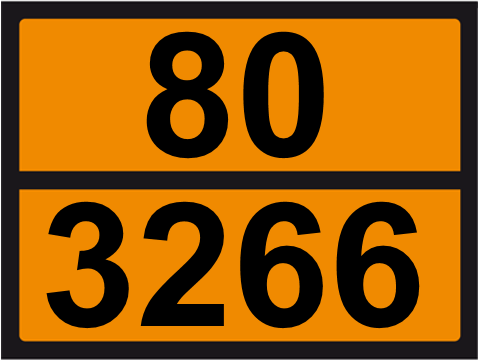 Orangefarbene Tafel mit Gefahrnummer 80 und UN 3266